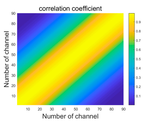 Figure 3 shows the correlation coefficient R of reflectance of two samples (rock from the roof and gangue-rock samples in Dataset 1). The horizontal and vertical coordinates of two spectra were corresponding to each channel; the colors in different depths indicate that values were different. R indicates the correlation between hyperspectral measurements of two samples at different channels. Higher R indicates more redundancy. From the figure, we could conclude that the hyperspectral reflectance values with the 5 nm spectral resolution had redundant values. A rough spectral range was selected based on spatial cross-correlation analysis; however, we still could not determine the contribution rate of each spectral band to the overall spectral characteristics. We could select the major channels to classify while the redundant channels were disused temporarily. The detailed selection process is presented as the following.