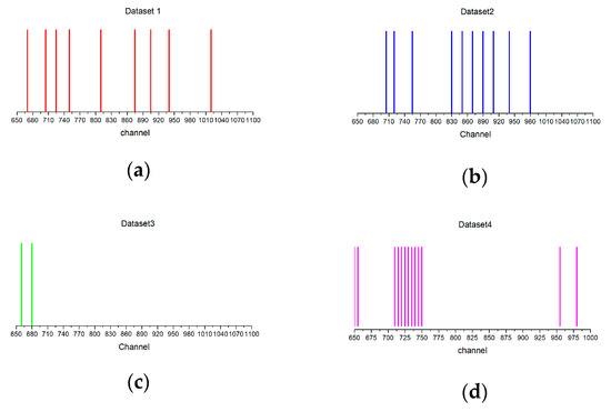 The selected bands with echo maximum by naïve Bayes (NB) classifier. (a) Dataset 1; (b) Dataset 2; (c) Dataset 3; and (d) Dataset 4.