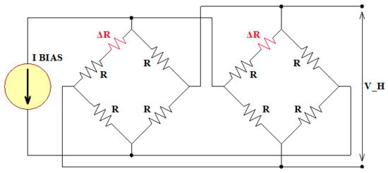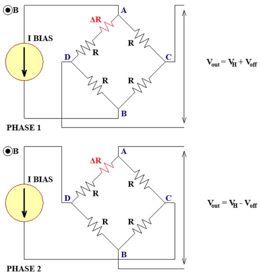 Since Hall sensors suffer from offsets due to various factors as explained previously, proper interfacing circuitry that minimizes these offset effects is necessary. One method that is used is pairing two matched sensors and connect them electrically in parallel but with orthogonal current directions as in References [,]. The equivalent circuit of a Wheatstone bridge sensor is shown in Figure 1. Proper offset cancellation is possible if the two sensors have exactly matching properties. However, this is very difficult to achieve in practice. Electrically this matching implies that the change in the resistance that appears in one leg of the bridge must be equivalent in the two sensors.