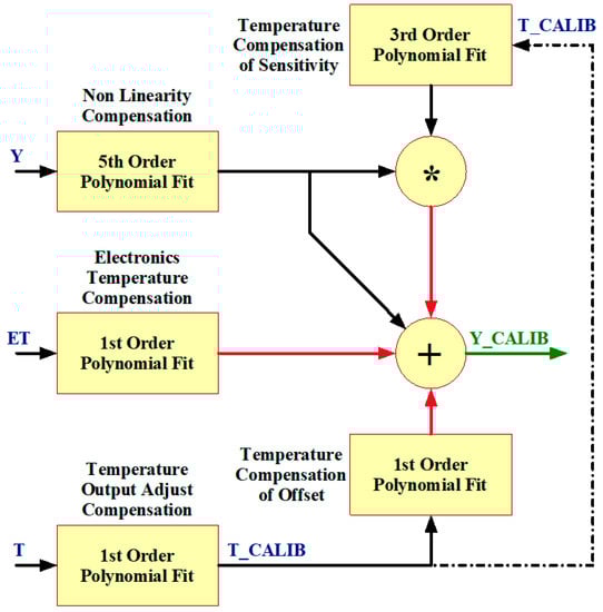 The roles of the yellow blocks of Figure 4 are explained as follows. The block “Nonlinearity Compensation” corrects the nonlinearity of the signal over the ±2 T magnetic field range using a 5th order polynomial. The block “Temperature Output Adjust Compensation” converts the PT100 voltage output to a true temperature reading. This is then used in the block “Temperature Compensation of Offset” which makes the temperature signal suitable for compensating the offset drift with temperature. The block “Temperature Compensation of Sensitivity” corrects the temperature influence on the sensitivity. The electronics temperature is also read by a digital sensor and this is calibrated for using a first order polynomial when the ambient temperature of the instrumentation varies from the 24 °C reference.