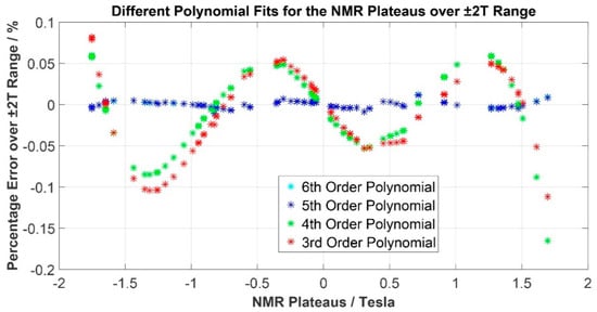 Nonlinearity compensation has the largest impact on the overall absolute accuracy of the final calibrated data given by the instrument. The Hall probe was exposed to the whole ±2 T range in 50 mT steps and the digitized voltage output from the instrument together with the actual NMR readings were recorded simultaneously. Therefore, the nonlinear relation obtained can be modelled using different orders of polynomial fits whose residual percentage errors are depicted in Figure 5 for the mean NMR plateaus over the ±2 T range.