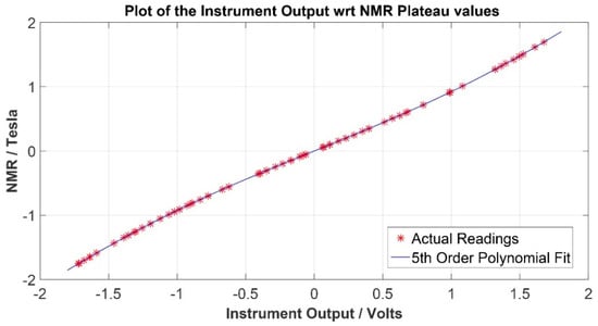 From Figure 5 it can be concluded visually that the best percentage error achieved using a 5th order polynomial fit resides in the range of ±0.01%. Orders higher than 5 resulted in no appreciable difference in the residual error, leading to the conclusion that the 5th order polynomial provides the best trade-off between accuracy and computation complexity. This is shown in Table 1 where a tenfold improvement is registered from a 4th order polynomial to a 5th order one for the reduction in the peak error. Nonlinearity compensation is thus applied using a 5th order polynomial fit for each axis. Figure 6 shows the actual implementation of the 5th order polynomial fit on the uncalibrated data obtained versus the NMR data obtained. In order to have the best fit for the response, each NMR locked magnetic field value, subsequently called a plateau, is first filtered so that all plateaus contain the same number of points. The NMR mean and the instrument output reading mean are taken for each plateau and the polynomial fit is then found as shown in Figure 6.