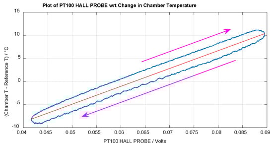 Graph showing the response of the PT100 output voltage to a two cycle temperature sweep from 14 °C to 34 °C. The response is modelled using the red linear plot. Hysteresis direction is shown by the purple arrows.