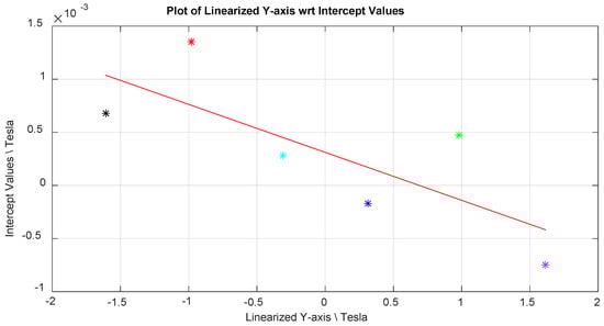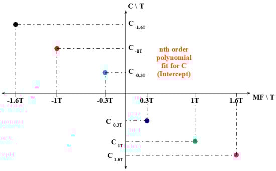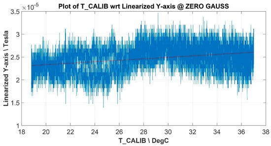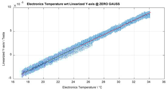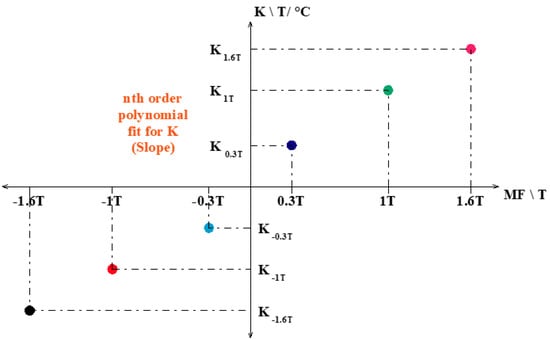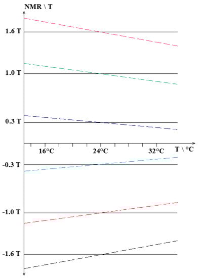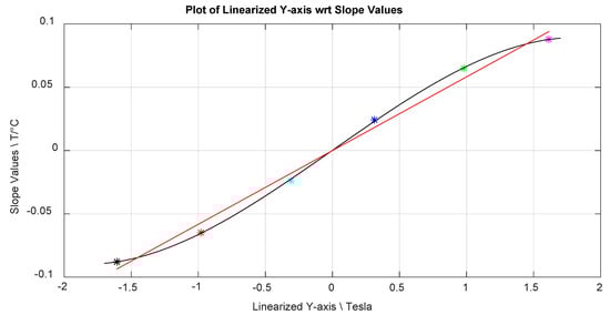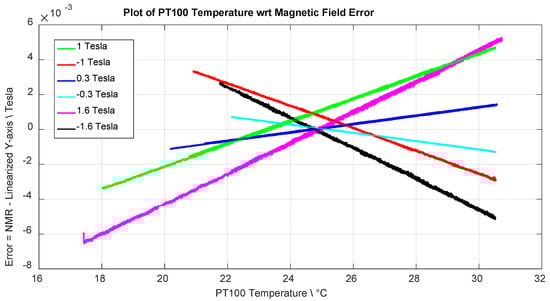 The mathematical application and the determination of the nth order polynomial fit for “Temperature Compensation of Sensitivity” involves quite a detailed explanation as follows. The data acquired for the locked NMR values of 0.3 T, −0.3 T, 1 T, −1 T, 1.6 T and −1.6 T against the temperature sweeps was initially processed and linearly compensated (using a 5th order polynomial as explained in Section 5.1) to achieve magnetic field values from the digitized voltage output of the instrument for each of the three axes. By subtracting the linearized magnetic field values from the NMR readings, the actual magnetic field error against temperature was found for every plateau. The data modelling plot in Figure 10 shows the hypothetical relations that are expected for the six plateaus which show that as the NMR reading is independent of temperature, the instrument output exhibits a negative temperature coefficient output with a slope that is dependent on the magnetic field value explaining the sensitivity response.