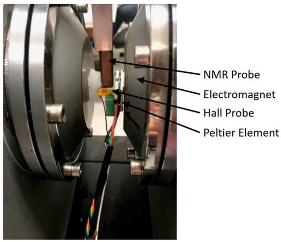 Temperature hysteresis sweeps were performed for locked NMR values of 0.3 T, −0.3 T, 1 T, −1 T, 1.6 T and −1.6 T while the Hall probe was heated and then cooled using a Peltier element for the temperature range of 17 °C up to 31 °C in each case. In the setup as shown in Figure 9, the NMR probe was placed on top of the Hall probe and both were sandwiched between the electromagnet poles. As the NMR probe and the Hall probe were in very close proximity to each other and the electromagnet poles were very large, it was assumed that the magnetic flux was identical in the physical region of the Hall probe and that of the NMR probe. On the right-hand side, the Peltier element was placed in physical contact with the Hall probe and one of the electromagnet poles.