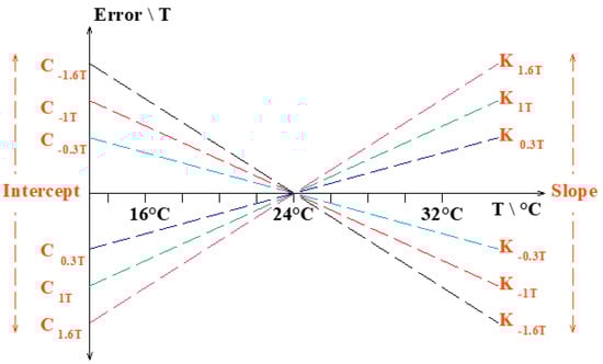 As theoretically explained, the slope values plot shown in Figure 16 and the intercept values plot shown in Figure 17 are extracted from Figure 15. Linear and cubic polynomials are tested in modelling the relation in Figure 16 to see the error reduction upon application of the algorithm for each case attained using “Temperature Compensation of Sensitivity” after linearization was performed. The intercept relation in Figure 17 was only modelled using a linear fit.