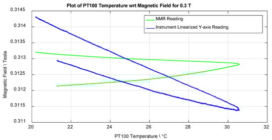 The application of this algorithm was applied to the real obtained data from the instrument and the NMR. Figure 14 shows the real response for the temperature sweep in the case for the 0.3 T reading. As the Peltier element heats up and cools down, the iron pole of the electromagnet in contact with the Peltier element also registers a change in temperature. The change in temperature results in a slight change in the magnetic field which is indicated by the NMR reading in green in Figure 14.