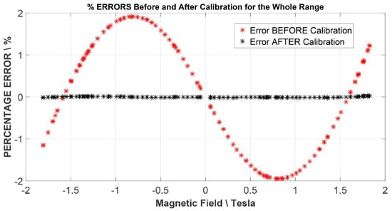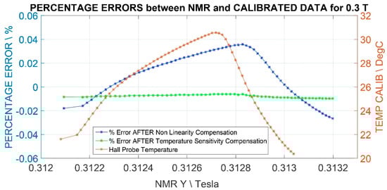 “Temperature Compensation of Sensitivity” caters for temperature changes across the whole magnetic field dynamic range as an addition to correcting the offset at zero gauss as performed in “Temperature Compensation of Offset” test. It is expected that the calibration error reduces more upon implementing temperature sensitivity compensation. This is due to the fact that the response of the Hall probe for temperature changes at different fields varies across the whole range. This must be modelled correctly to have a well calibrated instrument.