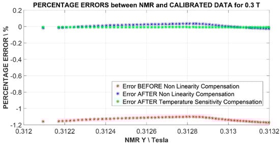 Calibration result Table 3 summarizes the absolute percentage errors obtained for all axes of each instrument before and after calibration while Figure 19 shows graphically the improvement obtained for the Y-axis. Apart from a reduction in the mean error which effectively results in an offset of the true reading, one can also note that calibration decreases the spread in the error. Predominantly the mean error is reduced by the “Nonlinearity Compensation” block as shown in Figure 20 while the spread in the error is then reduced by “Temperature Compensation of Sensitivity” as shown in Figure 21 for the 0.3 T case. We see that as the temperature of the Hall probe is increased from 21 °C up to 31 °C from Figure 21, the instrument registers a positive percentage error increase which is reduced significantly when temperature sensitivity compensation is applied.