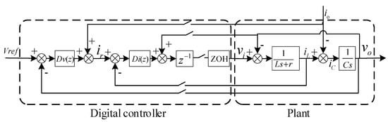 Figure 2 shows a diagram of the multi-loop inverter control structure [11,12,13], in which the model of Plant corresponds to Equation (1). Three signals are sensed: the inductor current, , the output voltage, , and the load current, . The inductor current is sensed for the regulation of the current loop. The output voltage is sensed for both the voltage regulation and the “back electromotive force (EMF)” decoupling. The load current is sensed for the feedforward to compensate the load fluctuation. Through the two feedforward channels, the outer-loop voltage has no effect on the inner-loop current and the load current has little effect on the output voltage. Then the multi-loop control structure is simplified to the dual-loop control structure shown in Figure 3.