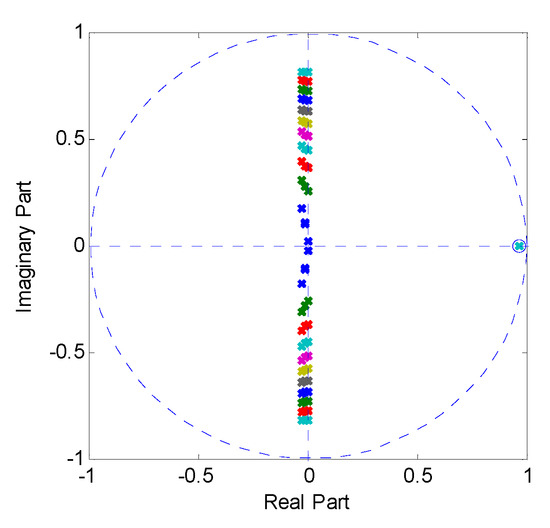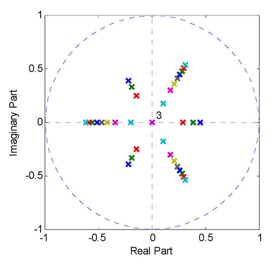 From Equation (2), the poles of the closed-loop deadbeat control system were located at the zero point in the complex plane. If the system parameters drift, the actual control will deviate from the expected, and even the system will be unstable. In this study, the inductive core was made from iron‒nickel high-flux magnetic powder, and the inductance decreased with the increase of the current. Resistance had a positive temperature characteristic. According to the data sheet and the experimental data, the variation of the inductance was within 0.6–1 times of the design value and the variation of resistance was within 1–1.7 times of the design value. Figure 6 shows the pole distribution of the current loop with the drift of the inductance and resistance. Considering that the variation of the capacitance was within 0.7–1.1 times of the nominal value, the pole distribution of the voltage loop could be plotted, as shown in Figure 7. In Figure 6 and Figure 7, it can be seen that the poles are distributed in a unit circle centered at the origin, guaranteeing the robustness of the proposed scheme.