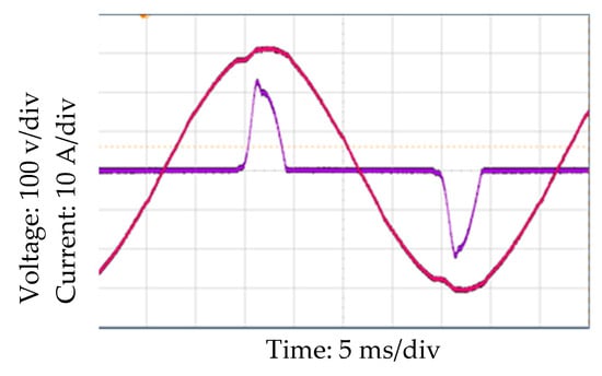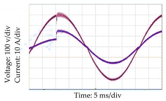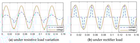 Referring to Figure 2, a simulation model was set up, and the simulation results of the output voltage and the current are shown in Figure 8. Figure 8a shows the simulation results of the output voltage and the current under resistive load variation from half load to full load. Figure 8b shows the simulation results of the output voltage and the current under rectifier load. From these results, it follows that the controlled PWM inverter can maintain a sinusoidal waveform even under a sudden load change and periodic fluctuation.