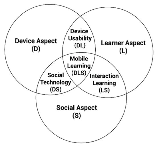 Ally [19] describes a Framework for the Rational Analysis of Mobile Education (FRAME). This model shows that mobile learning is composed of the intersection between three parts: mobile technologies, human learning capacities, and social interaction [13]. The FRAME model (illustrated in Figure 1) represents the three fundamental intersected components: device (D), learner (L), and social interaction (S). The interaction between two circles creates an attribute belong to both aspects. D and L create device usability (DL), L and S create an interaction learning (LS), D and S create a social technology (DS). The intersection of the three aspects creates mobile learning (DLS). DLS provides the collaboration among learners, the ability to access the information. It considered as a mediation that includes the interaction between learner, communities and information.