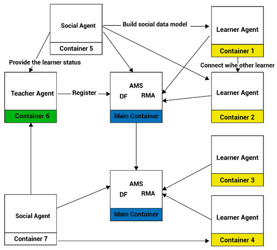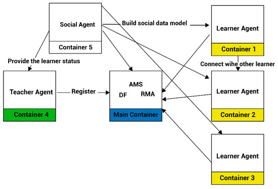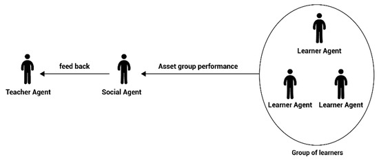 - Using the information gathered from the learner agent, the social agent provides the learner agent with the instructions that engage the learner in collaboration with other learners.
