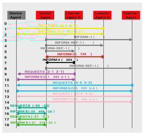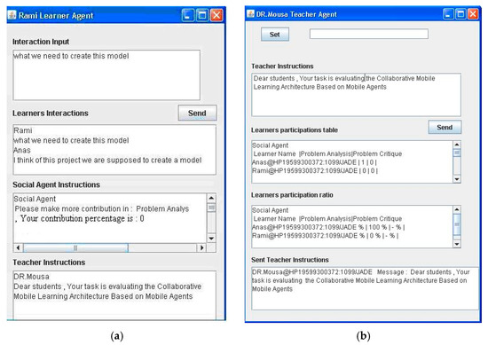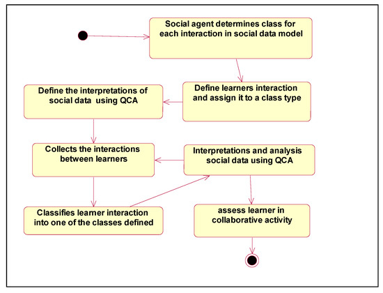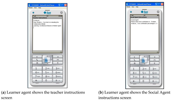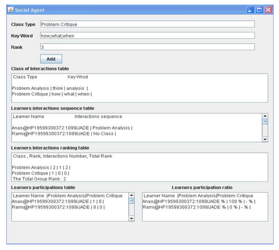 The collaborative learning interactions between learners involve defining the problem and relevant parameters, suggesting solutions among learners, evaluating and elaborating the suggested solutions, choosing the best solutions, and finding the best decision. The collaboration interactions increase the social support, the positive school attitude, the positive attitude towards education, the on-task behavior, and the level of interpretation for the learners’ group [33]. As described in Section 4, the social agent is responsible for maintaining social interactions among the learners to increase the collaborative learning within the group. This section demonstrates some functions that are responsible to the social agent in the learning process. In the proposed model, a collaborative learning environment is created to enhance the group interactions activity and increase the learner’s social contribution in discussion, counter-suggestion, evaluation, and elaboration.
