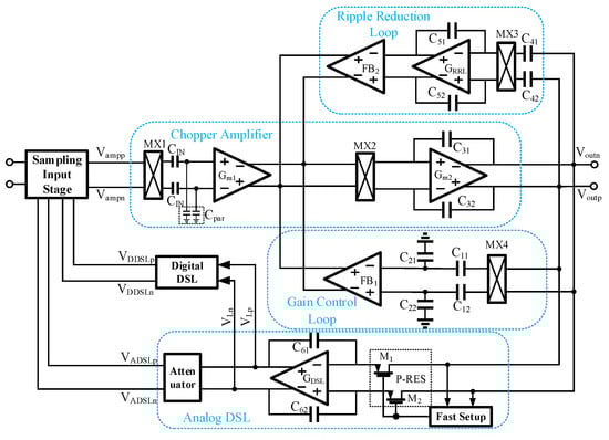 The proposed system diagram is shown in Figure 1. This ECG amplifier system consists of sampling input stage, chopper amplifier, ripple reduction loop, gain control loop and digital-analog hybrid DSL. The chopper amplifier adopts a basic two-stage Miller compensated amplifier, which is composed of MX1, MX2, CIN, Gm1, Gm2, C31 and C32. It has two feedback connections for gain control and ripple reduction, respectively. Its circuit implementation will be described in Section 3. The gain control loop of the ECG amplifier consists of MX4, C1x, C2x and FB1, which defines the pass-band gain as: