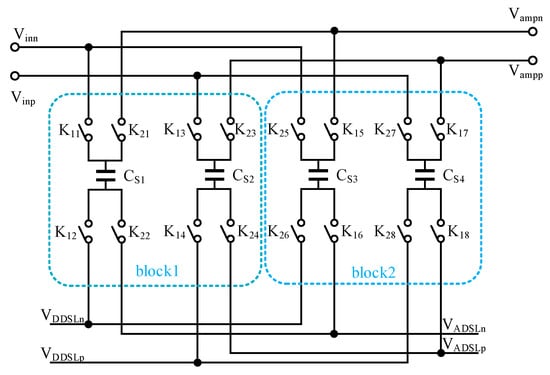 To boost the input impedance at low frequency, the DSL feedback loop cannot be connected to the input of Gm1. Therefore, the sampling input stage is added to the system for easy access to DSL feedback. The sampling input stage is shown in Figure 3. Block1 and block2 act as a ping-pong structure to implement a continuous-time system. K1x and K2x are controlled by a non-overlapping clock Φ1 and Φ2. CS1, CS2, CS3 and CS4 are sampling capacitors. In block1, during the sampling phase Φ1, K2x are open and K1x are closed. During the signal phase Φ2, K2x are closed and K1x are open.