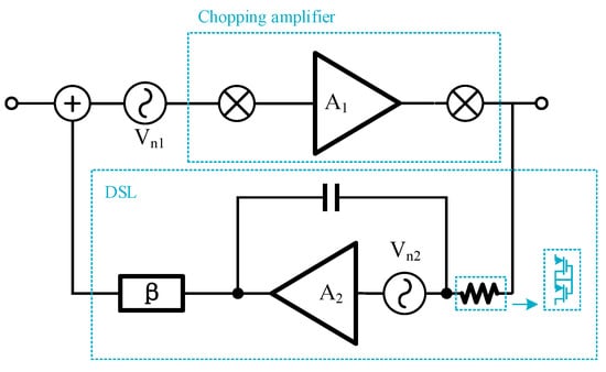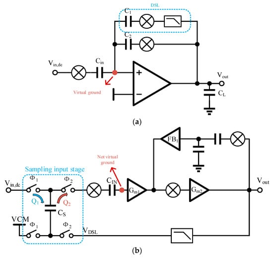 The traditional chopper capacitively coupled instrumentation amplifier with DSL is shown in Figure 4a. According to the analysis in [,], the positive feedback loop is rendered inoperative at DC. Therefore, the DC input impedance can be expressed as: