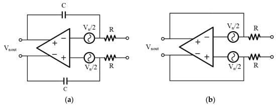 The DC-servo loop is employed to attenuate the EOS at the output, which is actually equivalent to a low pass filter. It can be seen from Figure 1 that the noise of the DSL circuit is chopped twice. Therefore, the DSL circuit noise cannot be reduced by chopping and it directly affects the noise performance of the entire circuit. In order to analyze the noise of the DSL, the circuit can be simplified to Figure 5a, where Vn is the equivalent input-referred noise of the DSL amplifier. Since fH is much smaller than fsig.min, the impedance of the capacitor is much smaller than the impedance of the resistor. Ignoring the impedance of the capacitor as shown in Figure 5b, we can find that the output noise is equal to the input noise and it is independent of the amplifier gain.