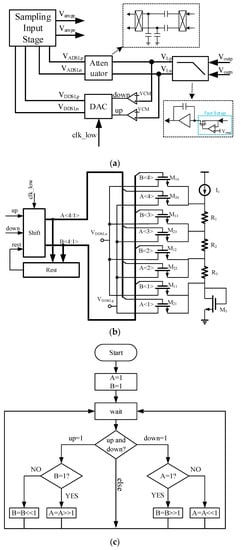 Furthermore, the cycle time of the DAC has to longer than the settling time of the analog DSL loop. The DAC of the DSL is shown in Figure 7b. The shift register controls eight switches to encode the output voltage, and the rest module monitors the output. At the same time, M11~M14 or M21~M24 turn on only one, otherwise, the shift register output will be reset to 1. The working flow chart of the shift register is shown in Figure 7c.