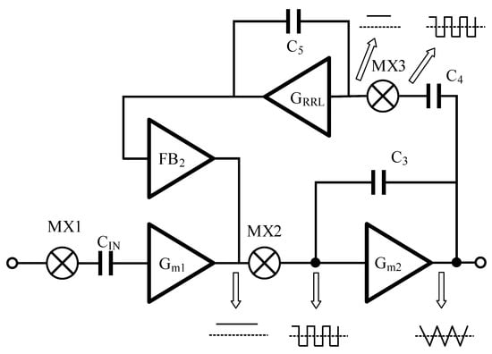 As shown in Figure 8, the offset of the transconductance Gm1, being chopped by MX2, appears as a square wave voltage. Then, the square wave voltage is integrated into a triangular wave to form an output ripple []. The RRL is used to suppress the output ripple, which consists of capacitor C4, chopper MX3, integrator and feedback transconductance FB2. This can be explained as follows. The capacitor C4 converts the output ripple into a square wave current. This current is chopped by MX3, and the resulting DC current is integrated to generate a DC compensation voltage that can eliminate the offset of the transconductance Gm1.