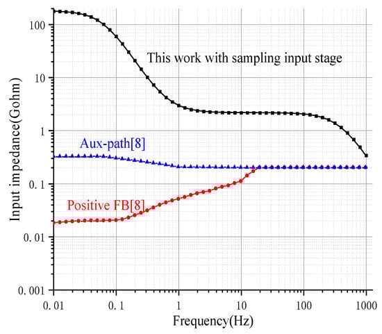 The input impedance of the ECG amplifier using different impedance-boost techniques is shown in Figure 10. This clearly shows that the proposed sampling input stage has better impedance improvement effect than aux-path technique and positive feedback (FB) technique. As described above, the DC input impedance is boosted to 120 GΩ at 0.05 Hz by the sampling input stage; at pass-band, the input impedance is 2.1 GΩ, which is determined by the equivalent switched-capacitor resistance of the chopper amplifier. The proposed ECG amplifier with very high input impedance characteristic can be applied to dry electrodes applications easily, which can effectively reduce the effects of signal attenuation and impedance variation interference, and its ultra-high DC impedance can reduce its input offset and DC current.