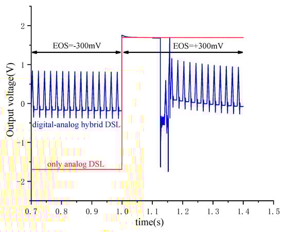 Figure 11 shows the transient waveform of the ECG amplifier with and without digital DSL. The range of EOS handling is less than ±300 mV when only use analog DSL. Its output is obviously saturated. However, the digital-analog hybrid DSL can effectively expand the EOS handling range.