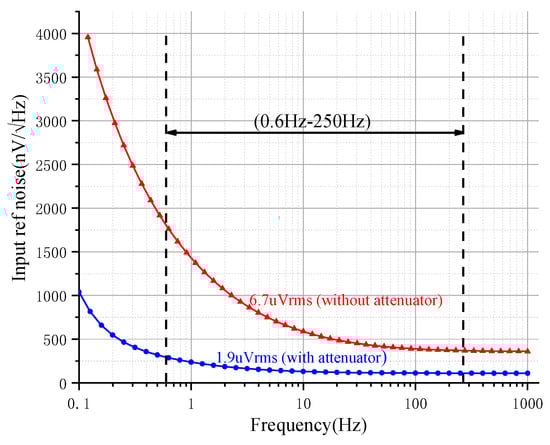 Figure 12 shows the input-referred noise power spectral density with and without attenuator, respectively. The results show that the system noise can be suppressed by adding an attenuator to the output of the analog DSL, and the integrated noise with attenuator on 0.6 Hz to 250 Hz is 1.9 μVrms.