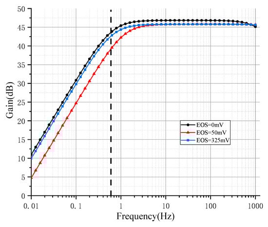 The AC frequency response of the ECG amplifier at different electrode offset (EOS).
