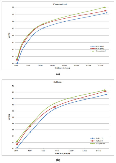 PSNR results. (a) Experimental results for the sequence “Poznanstreet”, and (b) Experimental results for the sequence “Balloons”.