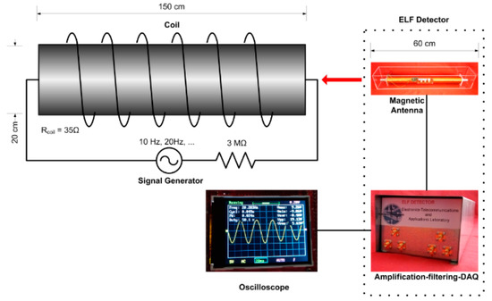 The entire test fixture is depicted in Figure 1 and consists of the constructed coil, the signal generator, and the oscilloscope. The device to be calibrated is the magnetic antenna and its associated electronics (amplification-filtering data acquisition). The Electronics-Telecommunications and Applications (ETA) laboratory (Lab) ELF SR magnetic antenna detector was used as the device to be calibrated. It must be stressed that one of the most important requirements that have to be met in this procedure is to keep the external magnetic interferences (noises) as low as possible. Therefore, the whole test fixture presented in Figure 1, as well as measurements, took place at the ELF detector installation site far away from an urban environment [35]. The magnetic field generated inside the constructed coil is captured by the magnetic antenna exactly in the same way the SR waves are captured in the free air. The design of ETA Lab’s SR magnetic antenna receiver started at the end of 2012. In 2014, the first prototype was implemented, while from 2015 to 2016, preliminary measurements took place in the region of Epirus North West Greece [36,37]. After several updates and tuning ups, the SR system was installed near the Doliana village in the Ioannina prefecture, Northwestern Greece. The ETA Lab’s SR magnetic antenna receiver started measuring on the 19 January 2016 till now with concurrent recordings and measures up to six SR modes [30,38]. Recent discontinuities in the SR spectra of the detection station have shown a possible interconnection between lithospheric seismic activity and the atmospheric electromagnetic ELF background [16,17]. In June 2016, the measurement station was added to the list of worldwide SR stations. In February 2019, ETA Lab’s SR data were made available to the scientific community through the MIT SuperCloud for the multi-station inversion calculation for global lightning activity. ETA Lab’s ELF detector consists of the magnetic antenna and the signal conditioning chain [30] as well as the data acquisition (DAQ) chain [34].