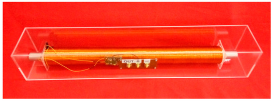 where I is the current flow, and μ0 is the vacuum permeability, considered to be 4π 10−7 Hm−1. The constructed coil is depicted in Figure 3a,b. The magnetic field generated inside the coil is measured extensively and found to be homogenous better than 98% in the area of interest that is sufficient enough for the test fixture purposes.