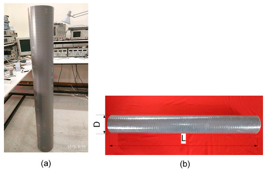 (a) The constructed coil (solenoid); (b) coil dimensions: length L is 150 cm, diameter D is 20 cm.