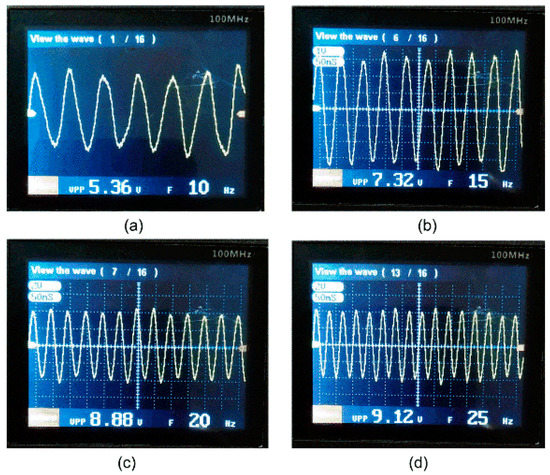 Instantaneous snapshots of four sinusoidal waveforms (a) 10 Hz; (b) 15 Hz; (c) 20 Hz; (d) 25 Hz taken by a portable oscilloscope, without noise.