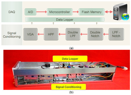 (a) Block diagram of the ELF detector (amplification, filtering, data acquisition (DAQ)); (b) implemented ELF detector inside metallic case.