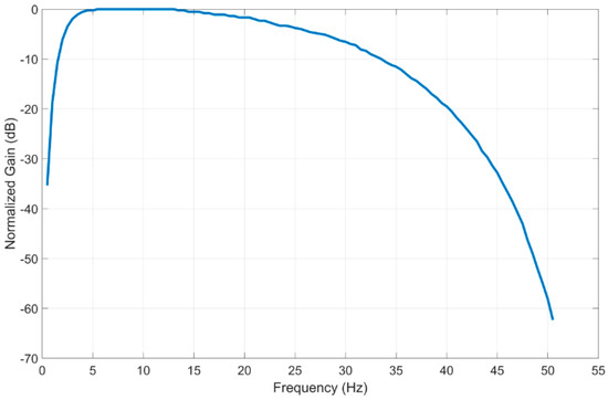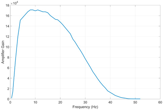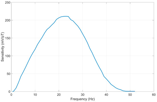 Table 1 shows the measurement results, using the sinusoidal fitting method as described above. These are the responses of the system for input of 42 pT, as mentioned before, on our magnetic coil for different frequencies. For example, at 20 Hz, the sensitivity of the magnetic antenna can be calculated as 58.94 μV/42 pT = 1.4 μV/pT, and the total system sensitivity is 8.70 V/42 pT = 207 mV/pT. Figure 8 depicts the four measured sensitivity values of the magnetic receiver coil versus frequency. Since a magnetic coil is expected theoretically to have an output voltage amplitude linearly proportional to the frequency (Equation (2)), the best linear fit was estimated as one may observe in this Figure, and the final estimated sensitivity of the coil is found through the line slope equal to 70 nV/pT/Hz. Figure 9 depicts the measured signal conditioning circuit (amplification and filtering) gain against frequency. The corresponding values at the selected frequencies are visible in the third column of Table 1. The total system (antenna and signal conditioning) as a function of the frequency is shown in Figure 10.