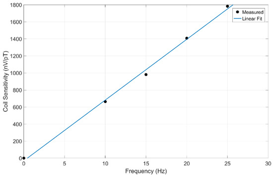 Measured magnetic coil (antenna) sensitivity against frequency along with the corresponding best linear fit line.