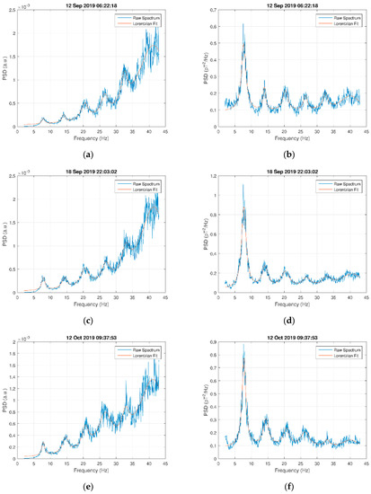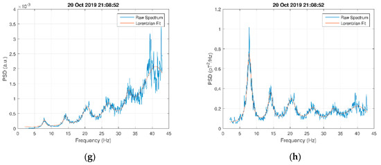 In Figure 11, recent measurements taken from ETA Lab’s system are shown in the fall of 2019. A nonlinear least square regression, using a Lorentzian-like function for the mathematical model for the resonance estimation, is performed on the raw spectrum. On the left images, the spectra are calculated by inverting the effect of the amplification and filtering system but not the magnetic coil. On the right, we observe the final spectrum in the input of the receiver (magnetic coil) inverting the effect of the antenna as well. Therefore, the vertical axis is displayed in corresponding units of the magnetic field’s spectral power density. The peak frequencies were fn = [7.8, 14.7, 20.2, 26.5, 33, 40] Hz, while the power spectral density (PSD) values for the six modes are clearly shown and varying from 0.2 to 0.9 pT2/Hz, which yields a signal-to-noise ratio greater than 10.