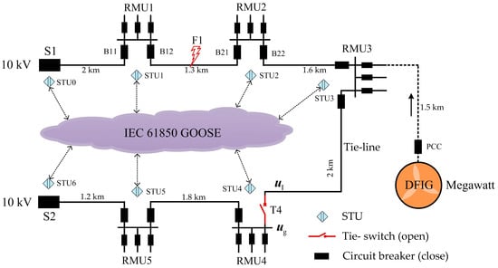 The primary system is a typical “hand-in-hand” ring network structure with S1 and S2 as the outlet switches by both sides of the substation and interconnected through the ring main unit (RMU) through two feeders led out from S1 and S2. The tie-line connects RMU3 and RMU4. All the inlet and outlet switches of the RMU are circuit breakers, and the tie-switch T4 is normally open with feeder voltage at a 10 kV level. A megawatt DFIG connects to the DN through RMU3. The secondary system is configured as a typical intelligent distributed FA independent from the overall information from the master stations or slave stations, and exchanges fault information by peer-to-peer communication through smart terminal units (STUs), to realize fast location, the isolation of feeder faults, and service restoration [,,]. The communication network supports optical fiber Ethernet structures according to IEC 61850, while the STUs at the substations and the RMUs communicate with each other through GOOSE, which is a fast and reliable message communication mechanism [,].