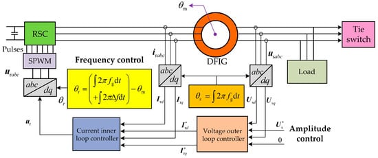 where the reference value of the stator voltage is fixed according to the equation of and . Obviously, the voltage outer loop controller and the power outer loop controller have maintained a unified structure. Both P/Q control and islanding control are largely realized through adjusting the axis component of the rotor, which is advantageous to the safe switching between different states of DFIG (grid-connection/islanding).