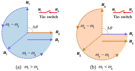 When is greater than 0, with as the reference, moves faster than , while moves close to at the speed of , as shown in Figure 4a. When is less than 0, with as the reference, moves faster than , while moves close to at the speed of , as shown in Figure 4b. In particular, after synchronization, reduces to 0, and the islanding voltage frequency recovers to , so that both and rotate at the angular velocity of to maintain synchronicity.