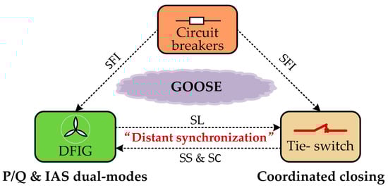 IEC 61850 GOOSE has been extensively applied in DN. The status communication between FA and DFIG by GOOSE is feasible and economic [,,]. This paper proposes a DN–DFIG coordination control strategy based on FA/GOOSE, as shown in Figure 5. Firstly, a GOOSE information channel is established between the DFIG and the FA to achieve the point-to-point rapid states communication between DFIG, circuit breakers and tie-switch. Where,