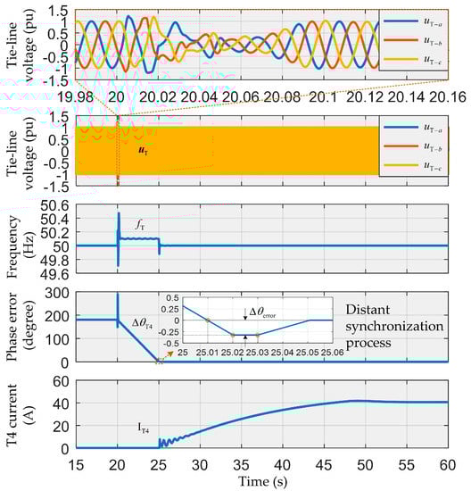 - Distant Synchronization: According to Figure 6 and Figure 7, as DFIG enters the islanding status under IAS control, , , , and maintain relative stability; the rising tendency of is suppressed and gradually reduced, showing a small amplitude of jittering as a whole. The jittering of is mainly due to the slow dynamic response of mechanical control and the sudden change of . The key point is that is controlled at 50.1 Hz, which causes the voltage phase error at both sides of the tie-switch changing from to gradually; synchronization conditions are detected by T4 at 25.01 s, and an SS message is immediately sent; DFIG sets to 0 upon the receipt of a SS message at 25.02 s to maintain the synchronization phase error at about , which obviously complies with the synchronous closing conditions of T4, as shown in Equation (10). Therefore, distant synchronization is achieved.