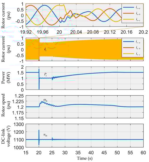 - Grid-Connection/Islanding Switching: The circuit breakers B12 and B21 trip at 20 s, and SFI is sent to the DFIG after a delay of 10 ms. Therefore, DFIG switches from P/Q to IAS control at 20.01 s. As shown in Figure 6, in the transient process of DFIG from grid-connection to islanding, due to the changes of control modes and sudden changes in electromagnetic power (0.5 MW), the voltage on the tie-line experienced the process of distortion and rebuilding for about five cycles, after which it stabilizes; at the initial period of tripping, the reaches about 1.25 pu maximally without uncontrollable overvoltage; the waveforms for the voltage frequency of the tie-line, and the phase error of voltages at both sides of the tie-switch flicker transiently as the circuit breakers trip. According to Figure 7, DFIG rotor current experienced the same distortion and rebuilding process as in case of the transient switching from grid-connection to islanding, during which no overcurrent is observed; after transient flickering, the electromagnetic power of the generator maintains at 1 MW; the DC-side voltage reaches a peak of 1220 V during the transient switching without overvoltage; due to the reduction of electromagnetic power;