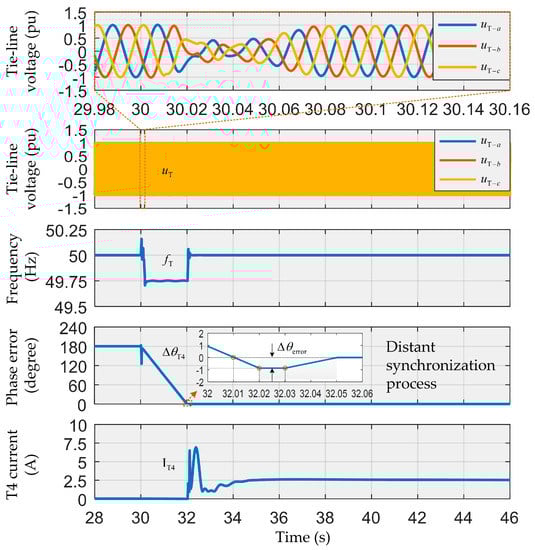 - Distant Synchronization: According to Figure 8 and Figure 9, in the DFIG islanding under IAS control, , , , and maintain relative stability; shows a small amplitude of jittering around 1.09 pu due to the slow dynamic response of mechanical control and the sudden change of . is controlled at 49.75 Hz, which causes the voltage phase error at both sides of the tie-switch changing from to gradually; synchronization conditions are detected by T4 at 32.01 s, and an SS message is immediately sent; DFIG sets to 0 upon the receipt of an SS message at 32.02 s to maintain the synchronization phase error at about , which obviously complies with the synchronous closing conditions of T4, as shown in Equation (10). Therefore, distant synchronization is achieved.