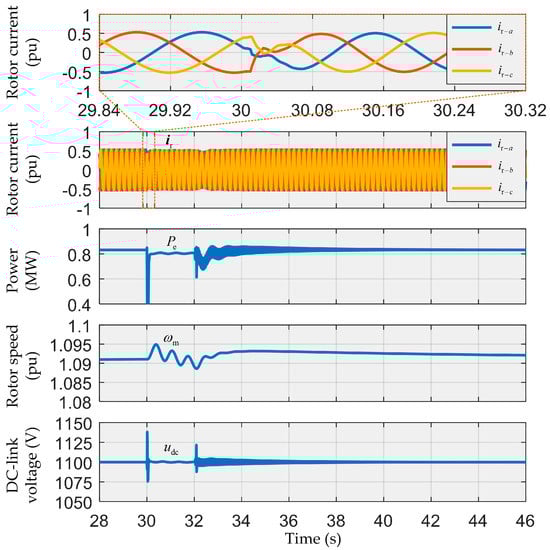 - Grid-Connection/Island Switching: After losing voltage support from the feeder at 30 s, DFIG receives an SFI message at 30.01 s, and switches from P/Q to IAS control mode. As shown in Figure 8, in the transient process of DFIG from grid-connection to islanding, due to the changes of control modes and sudden changes in (0.05 MW), experienced the process of distortion and rebuilding for about four cycles, after which it stabilizes; in particular, no large voltage is observed similar to those found in Scenarios 1 and 2 at the initial period of switching, but is more smooth; the waveforms for and flicker more weakly after the circuit breakers trip as compared with the Scenarios 1 and 2. According to Figure 9, experienced the same distortion and rebuilding process as in case of the transient switching from grid-connection to islanding, during which no overcurrent is observed; after transient flickering, maintains at 0.8 MW; the DC-side voltage reaches a peak of 1135 V during the transient switching without overvoltage; due to the reduced change of , the rotor speed rises not so significantly after tripping, but is effectively controlled without stalling under the MPPT in which the rotor reference speed is determined by the load.