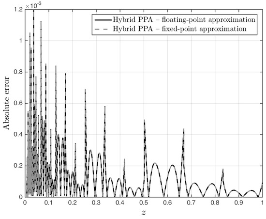 A comparative approximation error of the GR hybrid piecewise polynomial approximation systolic cell is presented in Figure 5. The figure shows a maximum absolute error of in the RSR curve achieving an SQNR equal to dBs and improving the 54 dBs reported in Reference [27] for the RSR block. This experiment compares the accuracy of the RSR curve between the continuous floating-point Matlab function (labeled as floating-point approximation, black line) and the proposed fixed-point systolic array architecture (labeled as fixed-point approximation, dotted gray line). As can be seen, the curves overlap perfectly thanks to the SQNR achieved; however, the maximum error and SQNR can be improved if the number of segments in the PPA-systolic cell is increased [19].
