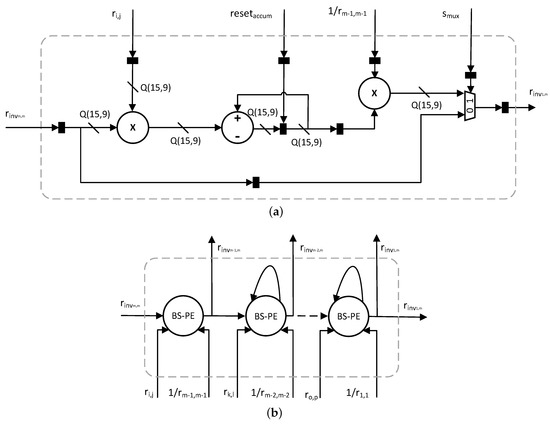 Matrix is obtained by using the back-substitution cells as illustrated in Figure 2, where the algorithm operations by column are associated to Equations (3) and (4). The architecture proposed for this important block is shown in Figure 6. The variable in is computed by dividing by . Note that the element is obtained in the GG block of the QR architecture, as shown in Figure 3. After that, the results are passed to the next processing elements in order to implement .