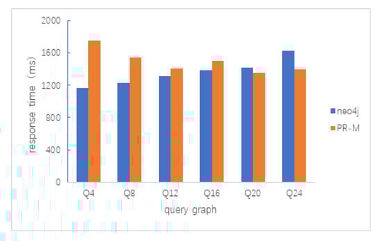 In clique query, each query graph is a complete graph, which indicates that the query graph contains edges. The clique query graph set contains six kinds of queries with the graph vertex number vary from 2 to 7. Experiment results on the US Patents dataset and the R-Mat synthetic dataset are shown in Figure 5 and Figure 6. With the analysis, Neo4j query response time is rapidly increased when the vertex number of the query graph goes big. As a comparison, the PR-Match response time growth maintains as a stable rate. The query efficiency of neo4j is lower than PR-Match when the vertex number of a query graph is larger than 5. This is because as the query graph density increases, the number of query resolutions will not be too large but the neighbor label density vertex increases at the same time. The pruning ability of vertex neighbor label coding is highly improved.