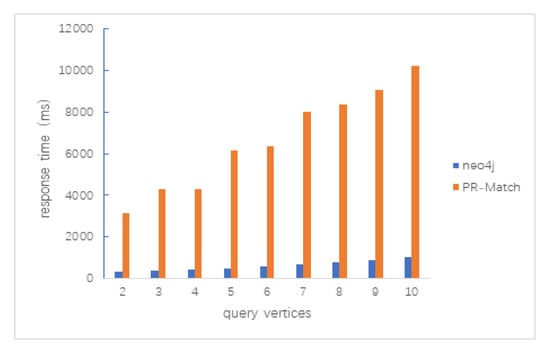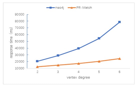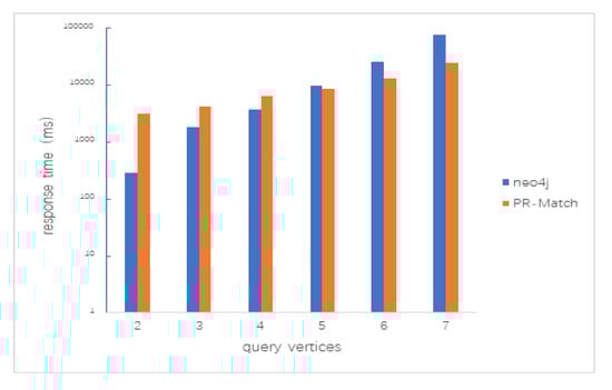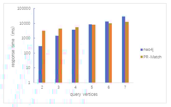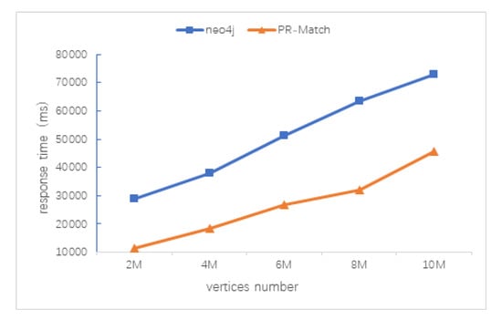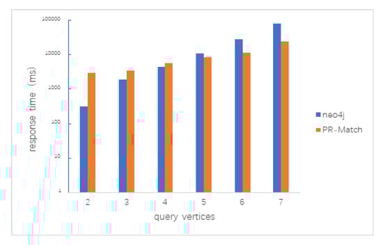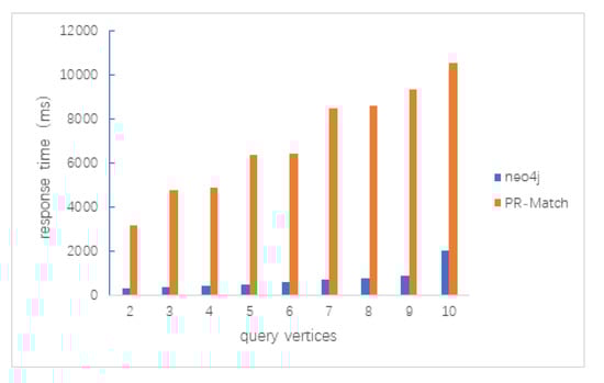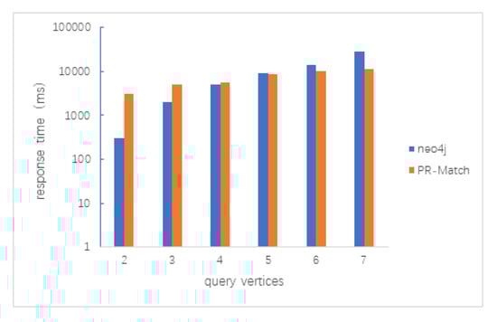 We conduct abundant evaluations and comparative experiments on the proposed PR-Match algorithm. We choose a proper data cleaning strategy based on the relationship of data volume, completeness, time-dependence and correctness [], and take the privacy of datasets into account []. The experimental results and analyses demonstrate that the PR-Match algorithm has good scalability with different sizes of graph datasets. In addition, the performance of the PR-Match algorithm is greatly improved when the vertex average degree of the data graph is large and the lables are more signed, which shows the feasibility and efficiency of the vertex code index. At the same time, the query response time of the PR-Match algorithm can be only slowly increasing with the size of graph datasets. Accordingly, the PR-Match algorithm has obvious advantages over the high performance graph database Neo4j, which shows that the PR-Match algorithm can be competitive for large-scale graph data matching.